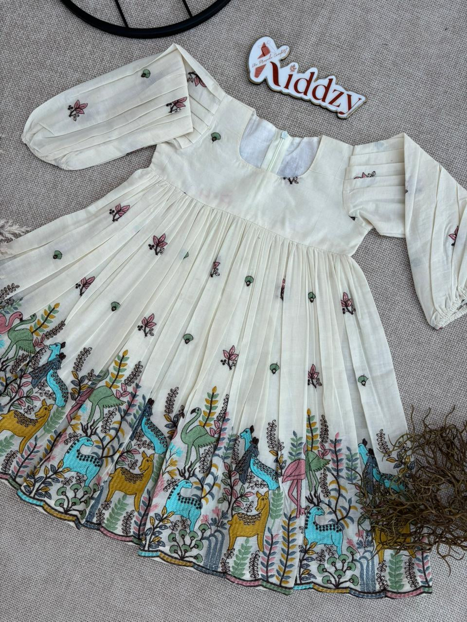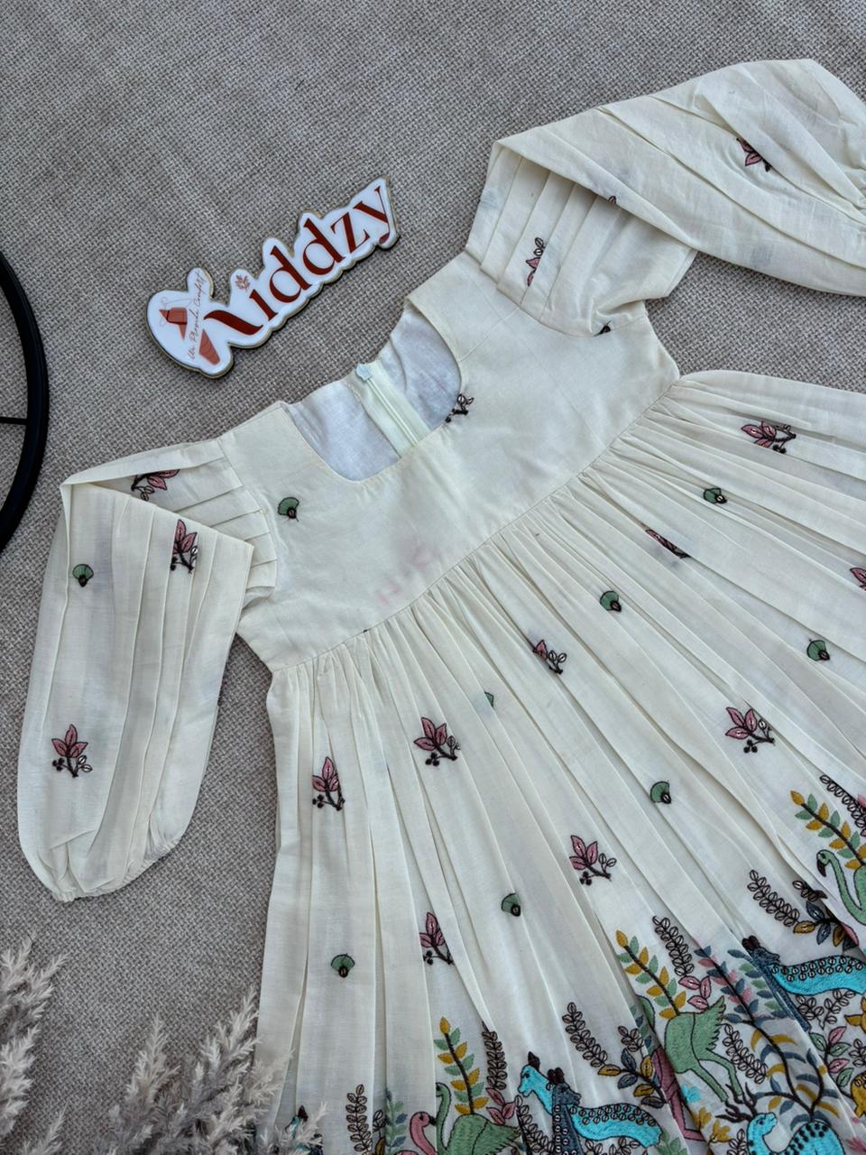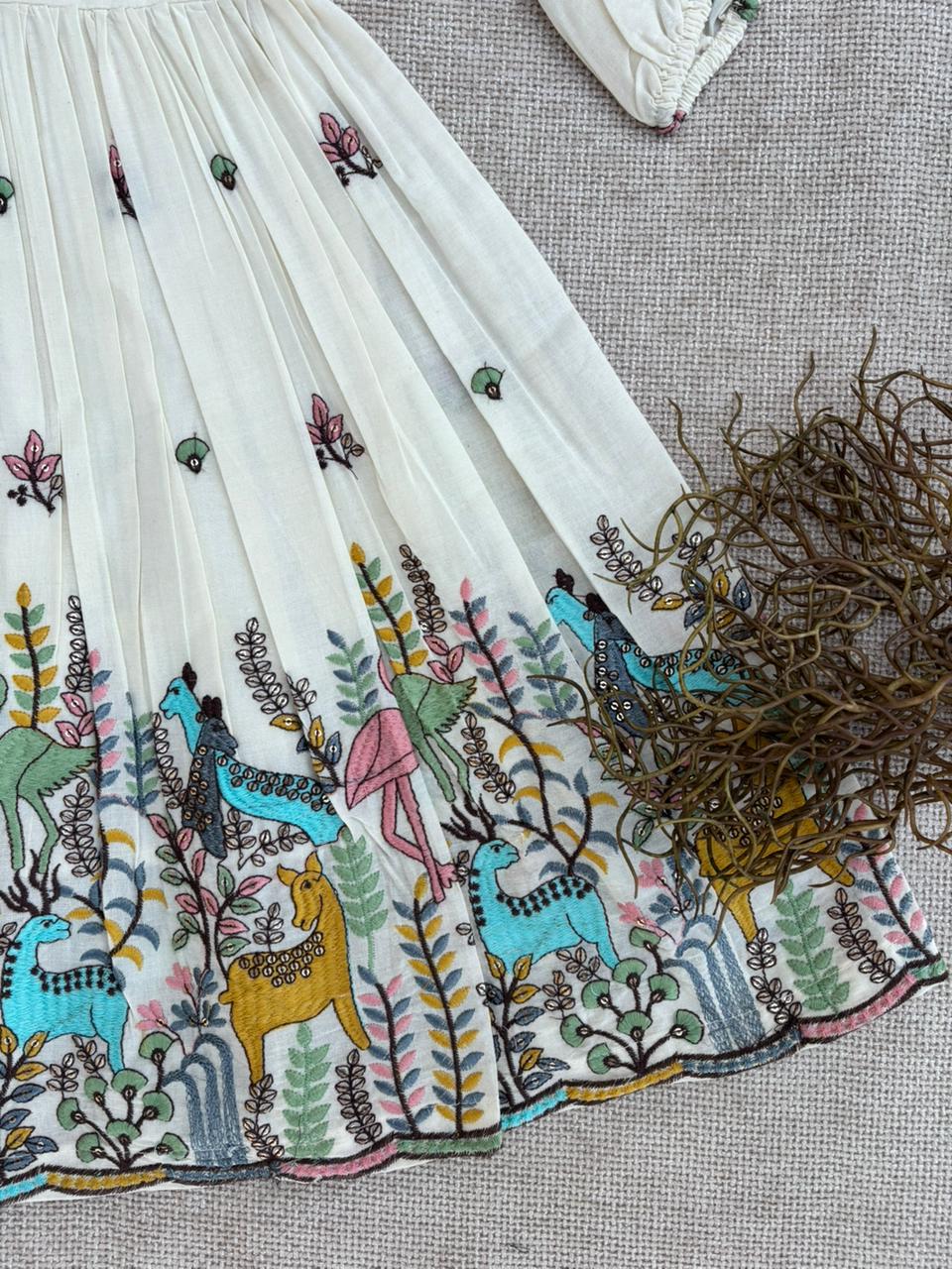 Girls Thread Embroidery Animal & Floral Pleated Frock