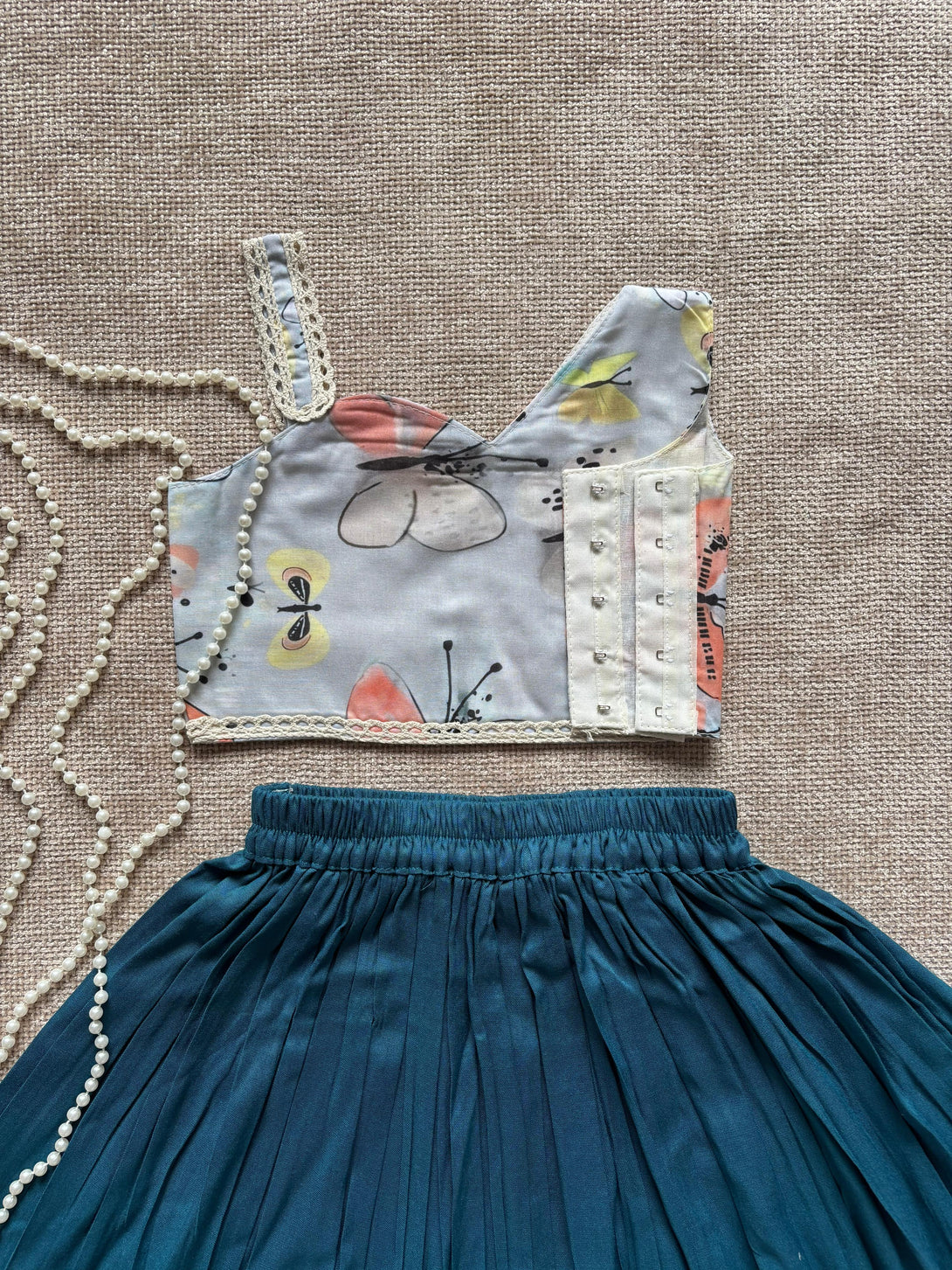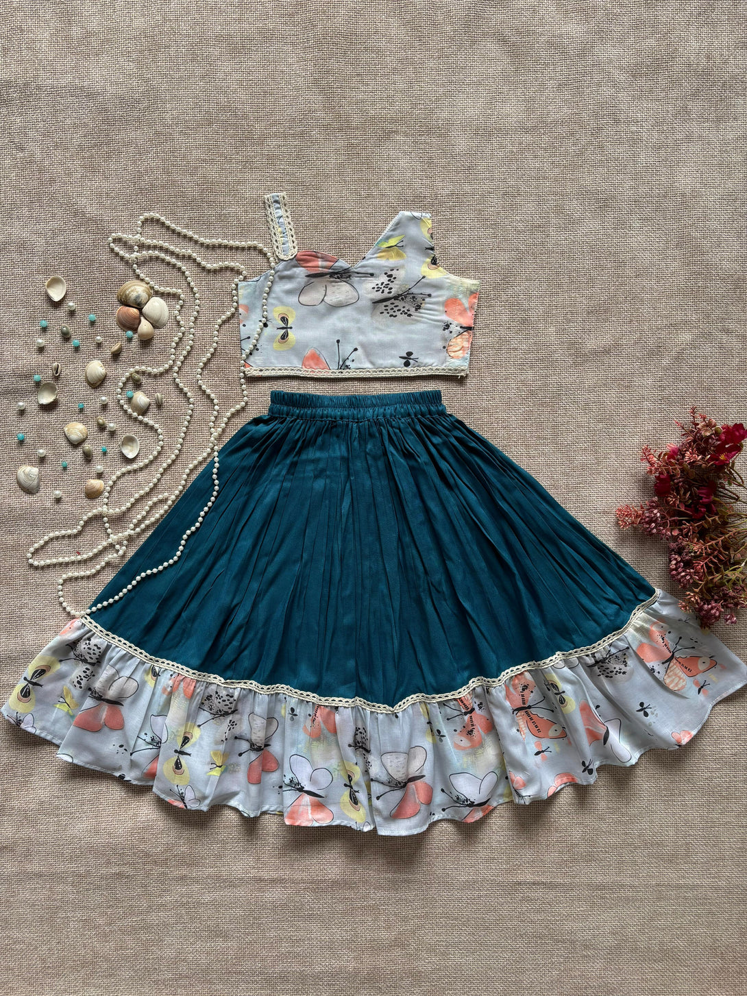 Teal Skirt & Pastel Butterfly Print Crop Top Set